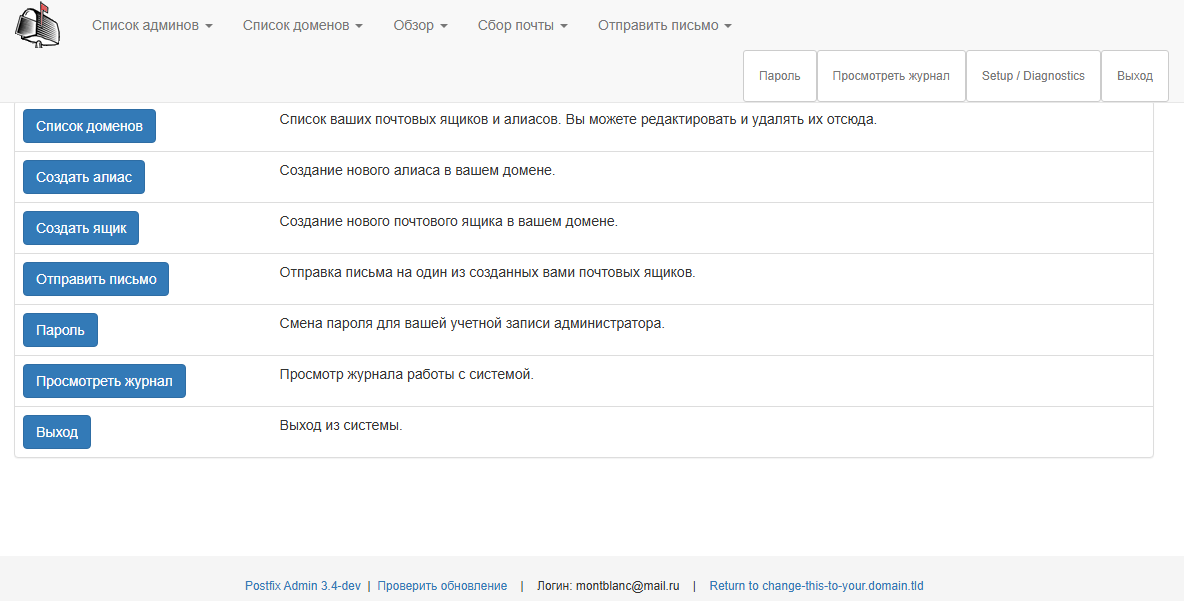 Сайт предложит настроить учётную запись администратора, после чего можно использовать Postfix Admin для администрирования почтовых доменов, ящиков и алиасов.