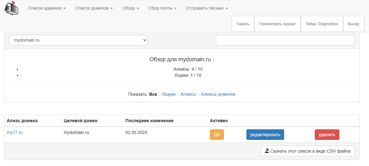 Пример почтового алиаса домена и домена, на который будет приходить почта:
